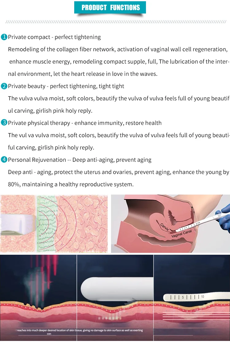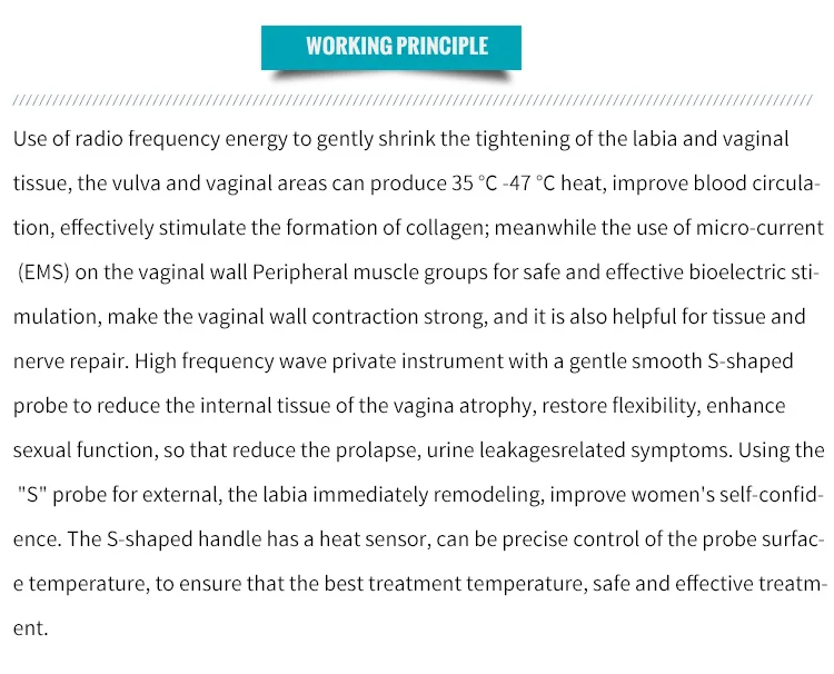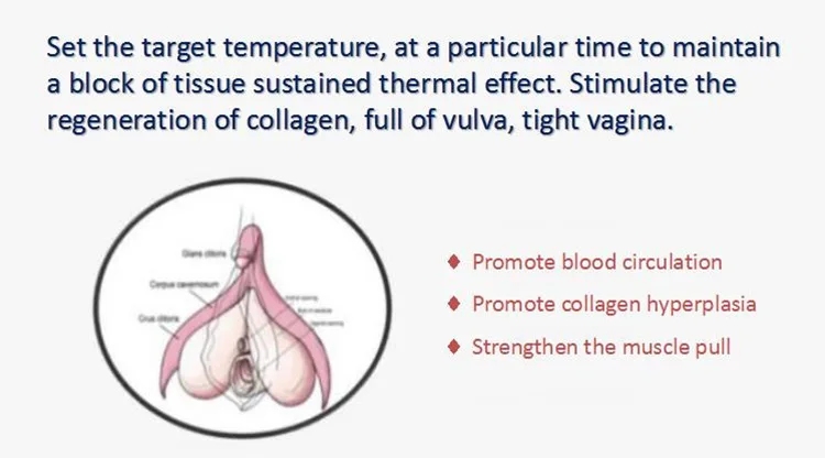 1. Use of radio// frequency energy to gently shrink the tightening of the labia and vaginal tissue, the vulva and vaginal areas can produce 35°C -47°C heat, improve blood circulation, effectively stimulate the formation of collagen;