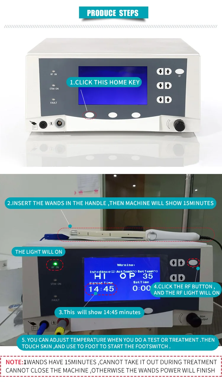 5. YOU CAN ADJUST TEMPERATURE WHEN YOU DO ATEST OR TREATMENT .THENTOUCH SKIN ,AND USE TO FOOT TO START THE FOOTSWITCH.