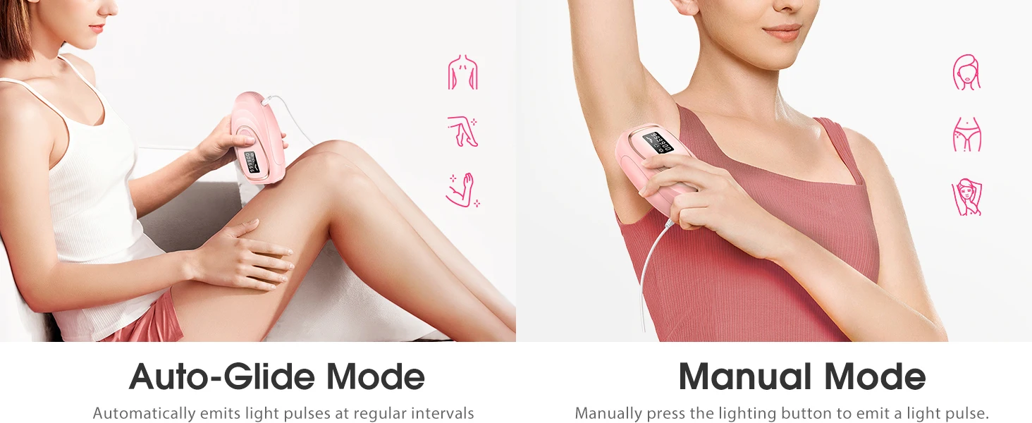【AUTO/MANUAL MODE & FULL BODY USE】 - The pulsed light epilator has an automatic mode (continuous flash) for the jersey, upper lip, chin, face and armpits and manual mode (single flash) for back, chest, belly, arms and legs. Not suitable for eyebrows.