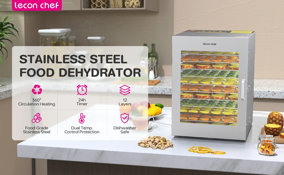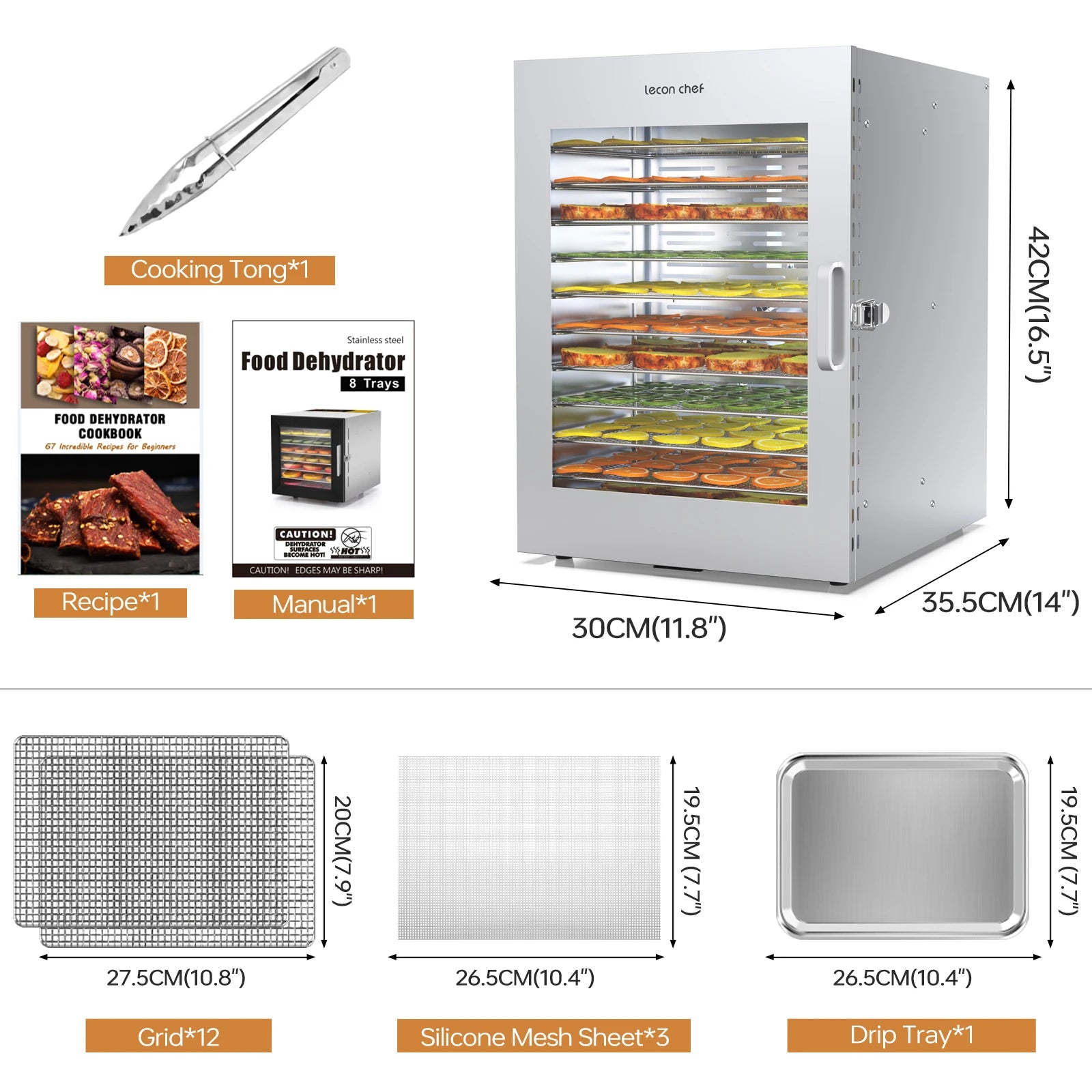 Lecon Chef Food Dehydrator Machine, 12 Stainless Steel Trays Food-Dryer 24H Timer & 194ºF Temperature Control 1000W Dehydrators