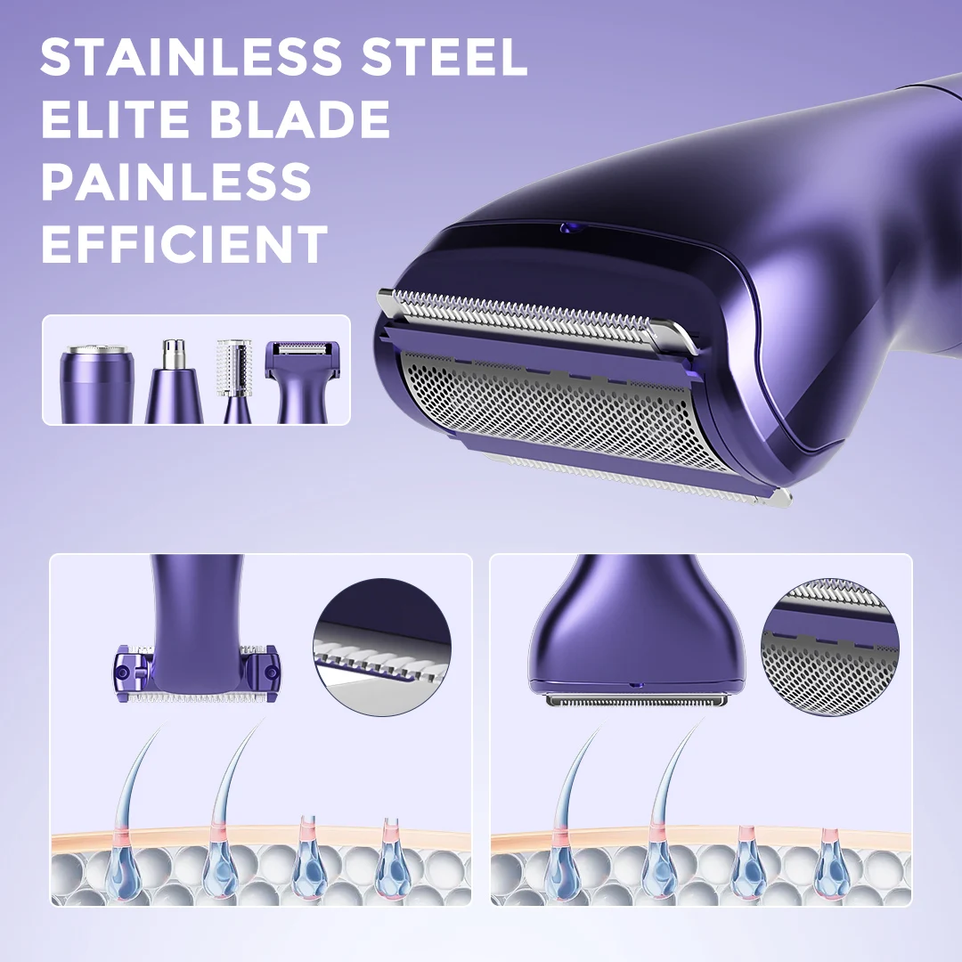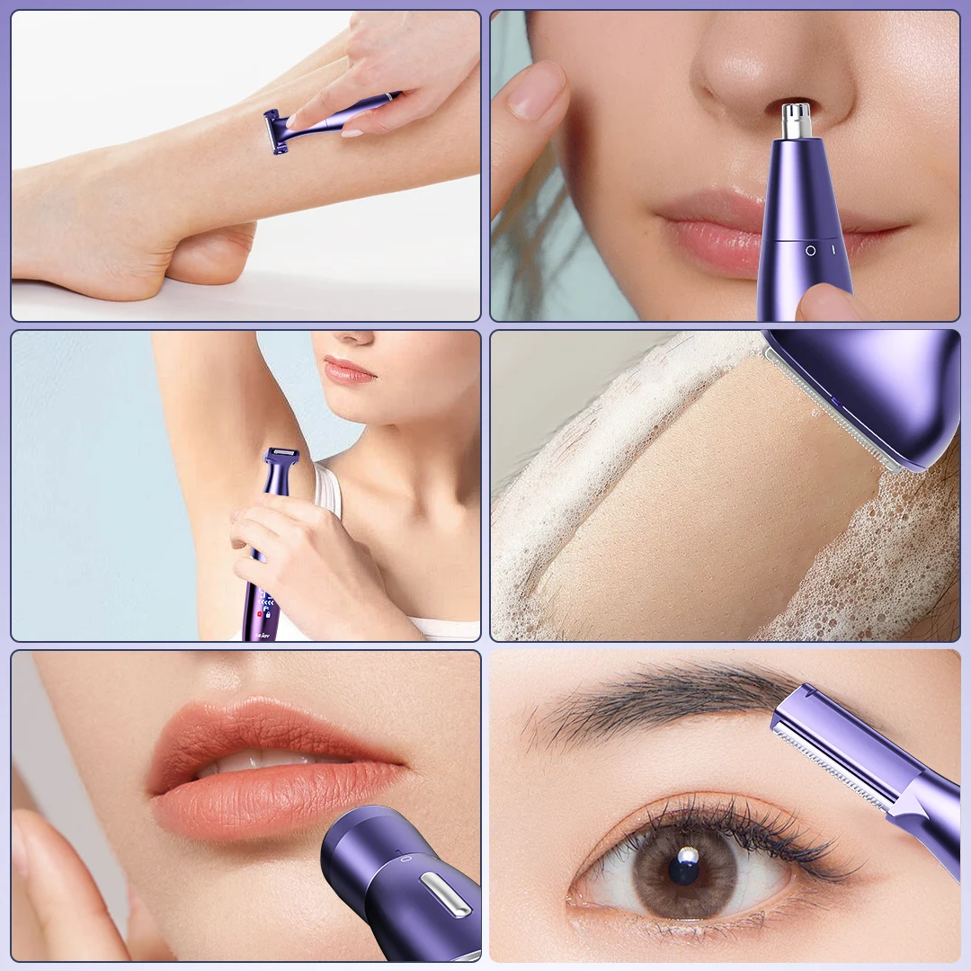 【6-in-1 Electric Shaver】: The women's electric shaver has 6 replaceable heads: large-area shaver, nose hair trimmer, small-area shaver, foil shaver, eyebrow shaver, and face shaver. It efficiently removes unwanted hair from the face, arms, legs, body, bikini line, and underarms, helping you maintain confidence and beauty without worrying about the small details.