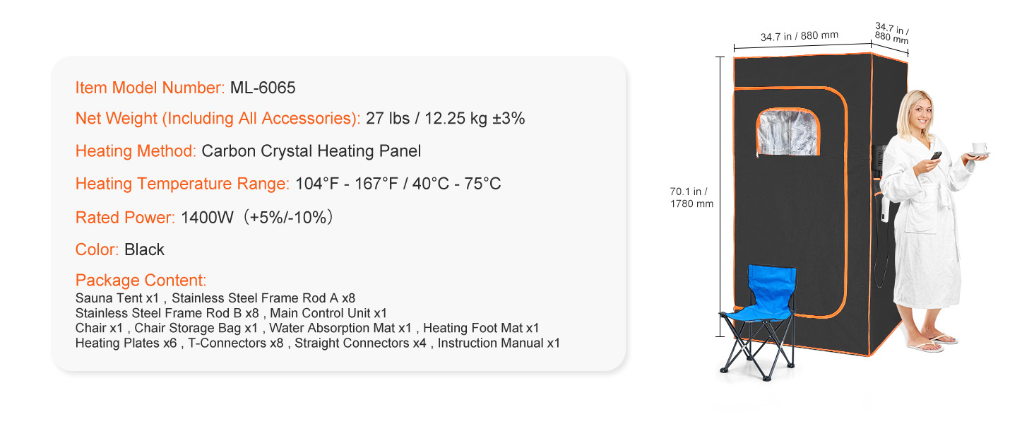 Portable Foldable Design: Owning a sauna tent is similar to having a mobile therapy hub. Its compact dimensions of 34.7 x 34.7 x 70.1 inches / 880 x 880 x 1780 mm let you enjoy a sauna whenever and wherever. The included portable storage bag simplifies storage or taking it along on travels