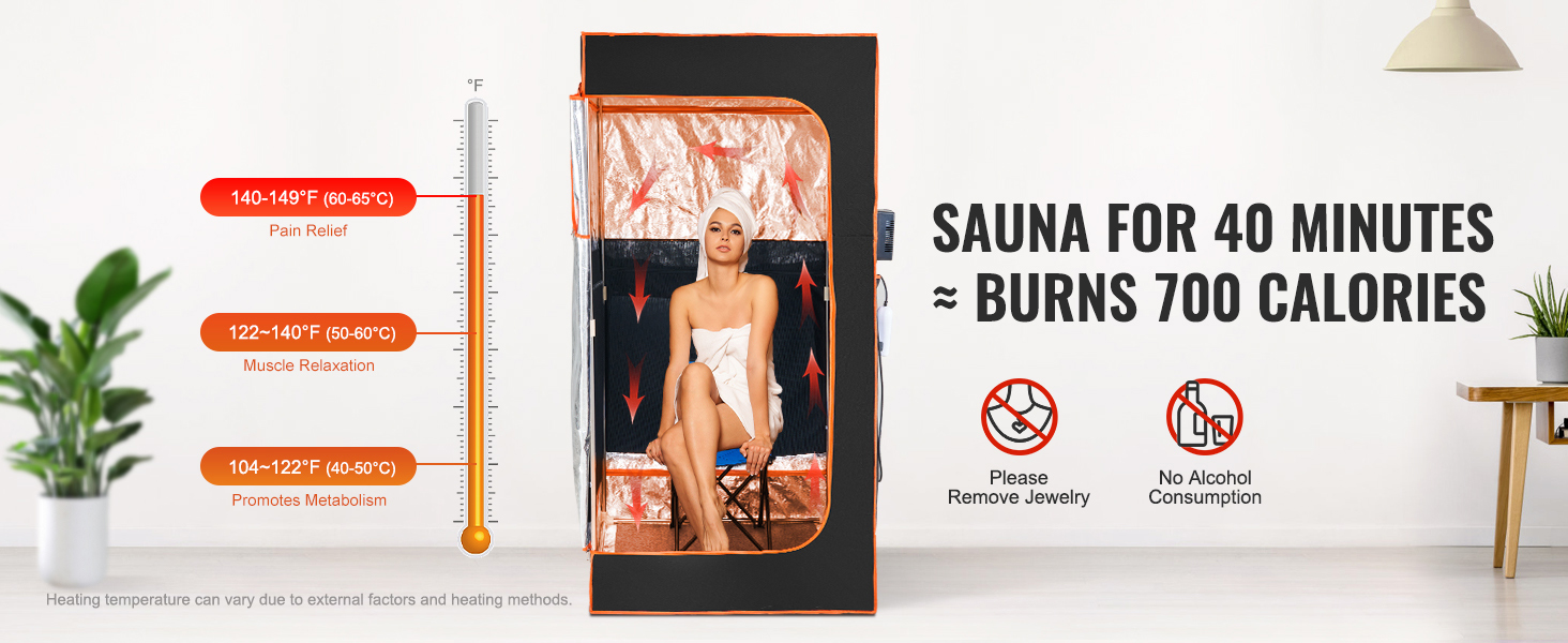 A 40-minute sauna session equals a 40-minute jog. For first-time users, we recommend starting with 15-20 minutes 1-2 times per week. Over time, you can extend to 35-40 minutes 3-5 times per week. Avoid wearing jewelry or drinking alcohol during use.